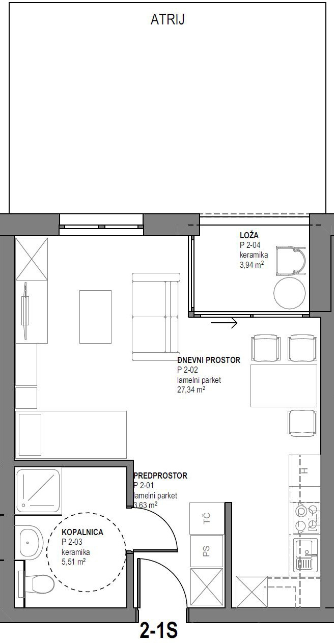 Namenjena so za bivanje ene osebe. Iz predprostora z garderobnimi omarami imamo vstop v kopalnico, naravnost pa v večnamenski bivalni prostor. Ob steni kopalnice je postavljena enojna postelja, ob zunanji steni pa sedežna garnitura z regalom. Na nasprotni strani je kuhinjski niz, ki se zaključuje z jedilno mizo, za katero bo prostora za več oseb. Stanovanje vključuje ložo.